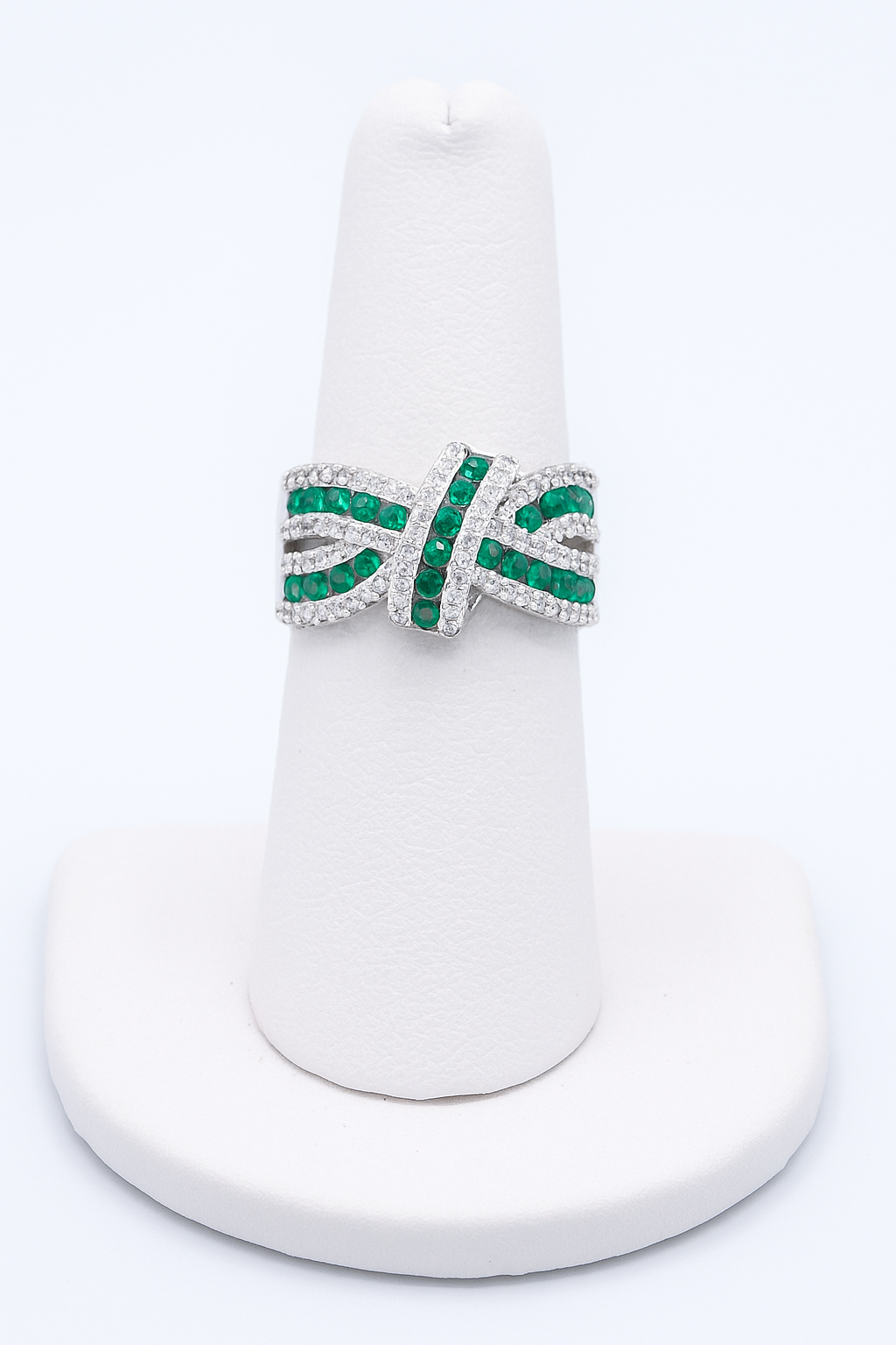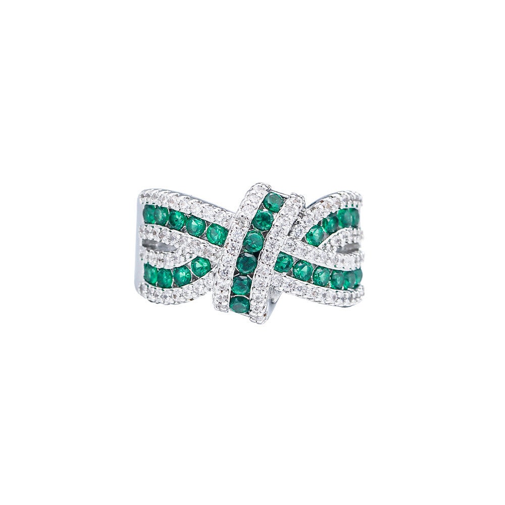 Make a bold statement with the Emerald Ribbon Twist Ring, a dazzling piece that intertwines elegance and sparkle. Designed with brilliant green cubic zirconia stones set in a graceful ribbon twist, this ring is accented by rows of shimmering clear pavé stones. The crossover design symbolizes connection and balance—making it both a striking accessory and a meaningful gift.