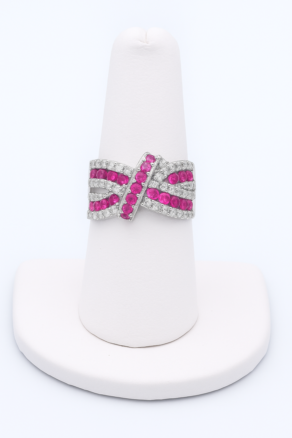 Bold, feminine, and full of sparkle, the Rose Radiance Ribbon Ring adds a vibrant pop of color to your jewelry collection. Featuring dazzling pink cubic zirconia stones set in an elegant criss-cross ribbon design, this ring is accented by shimmering clear pavé for a glamorous finish. Whether worn alone or stacked, it’s the perfect mix of playfulness and sophistication.