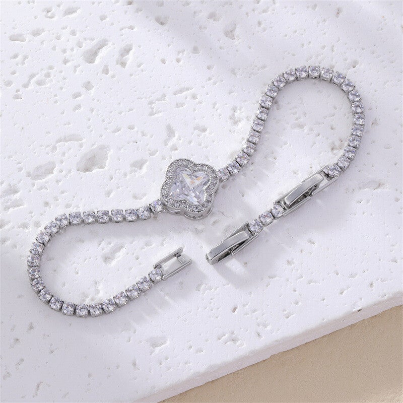 The Crystal Petal Bracelet sparkles with timeless beauty, featuring a delicate silver band adorned with brilliant white stones and a floral-inspired centerpiece. Hypoallergenic, tarnish-resistant, and perfect for any occasion, this bracelet adds an elegant touch to your everyday style or evening ensemble.