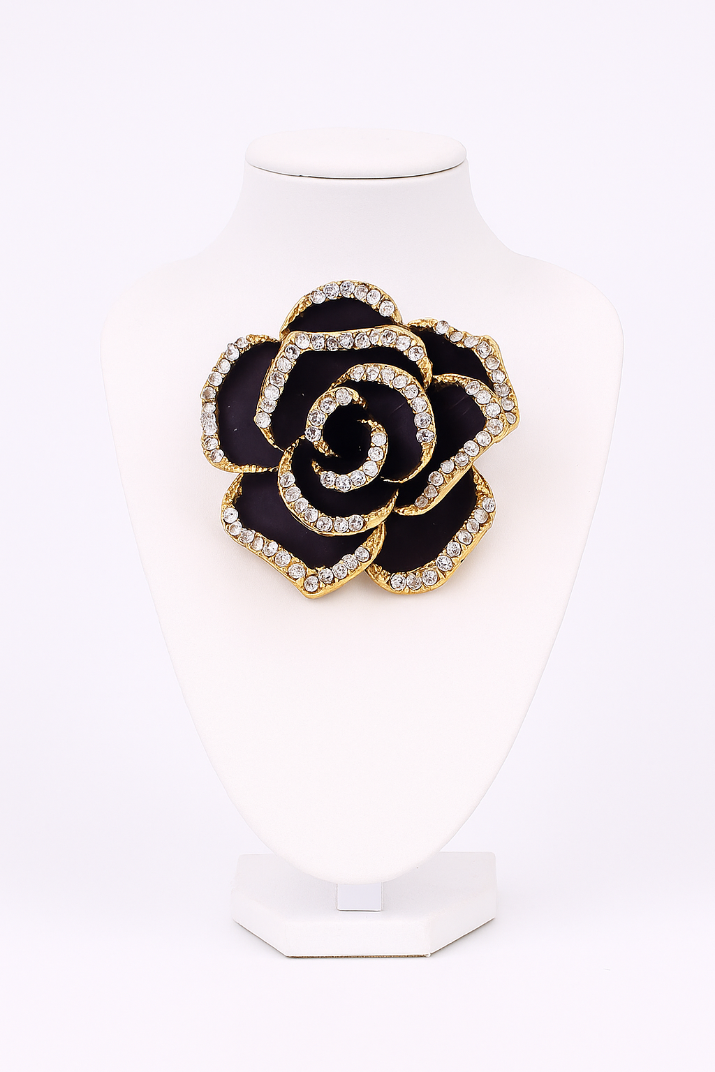 Dramatic and elegant, the Midnight Bloom Brooch features deep black enamel petals outlined in shimmering rhinestones and gold-tone trim. This bold piece adds a striking statement to any outfit, from evening wear to classic coats.